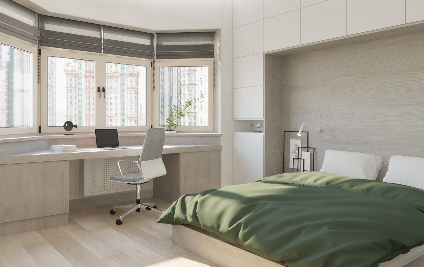And this is how the design of a bedroom looks like with a working corner in the bay window.