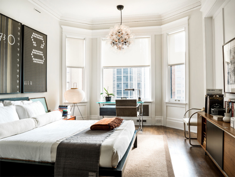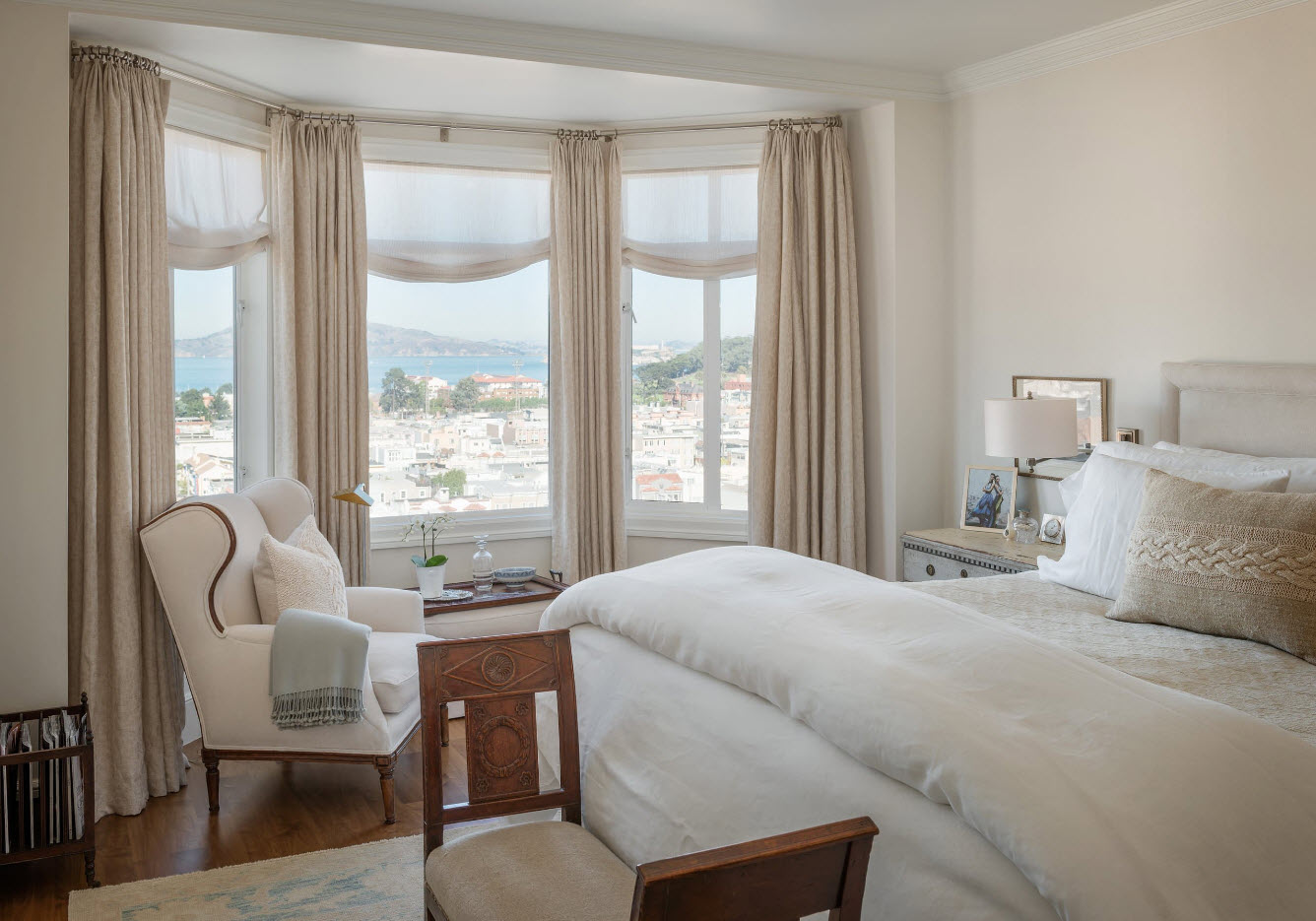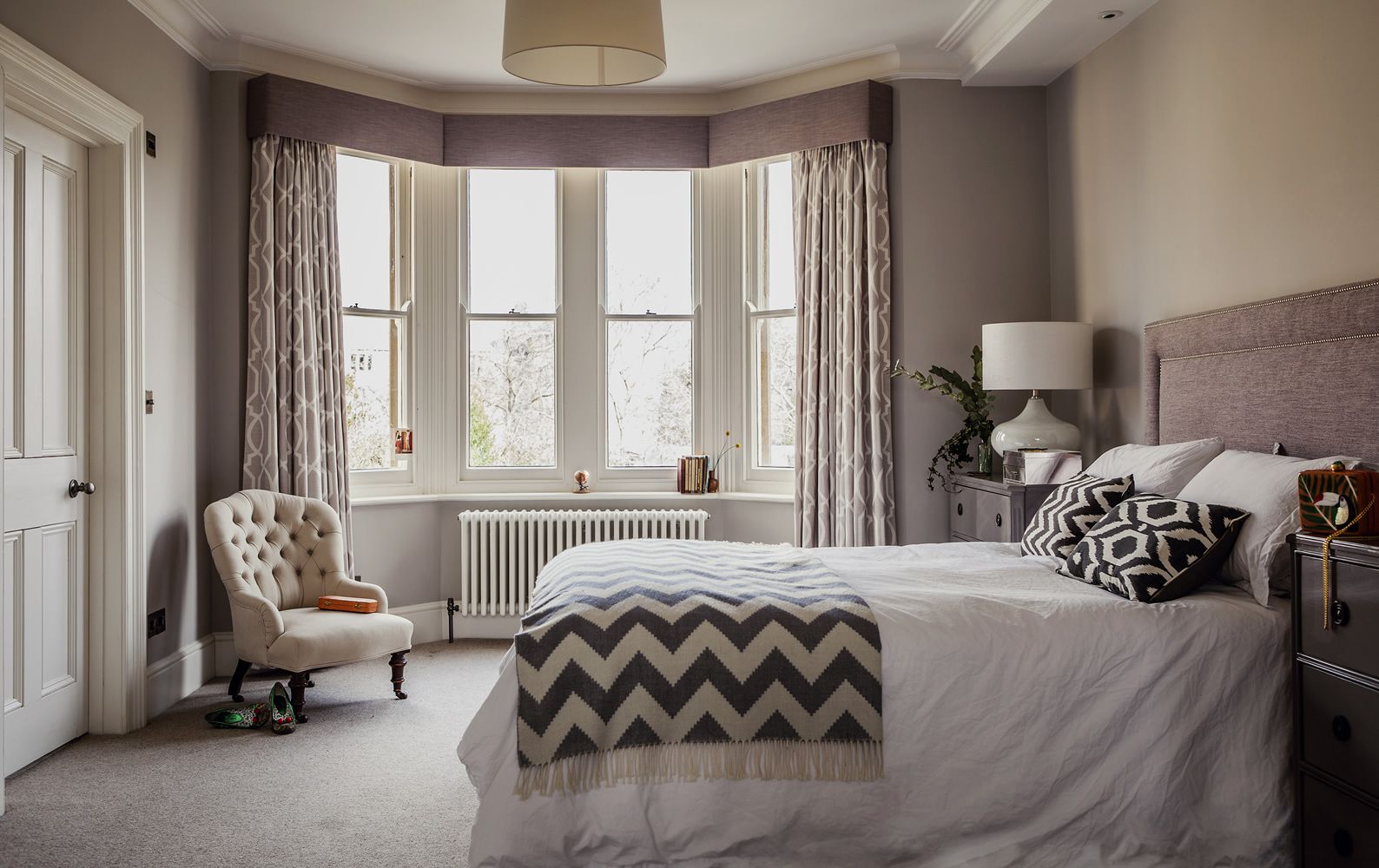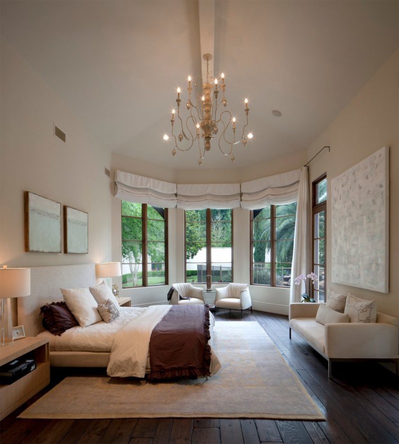 Something like this might look like a classic bedroom with a bay window. Everything looks laconic and quite beautiful. The lack of expressive colors helps to achieve an attractive feel.