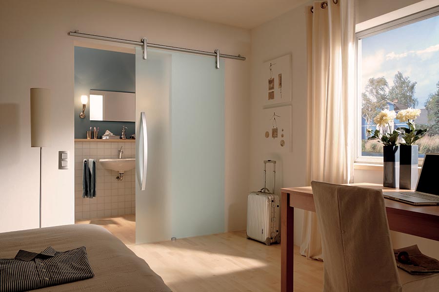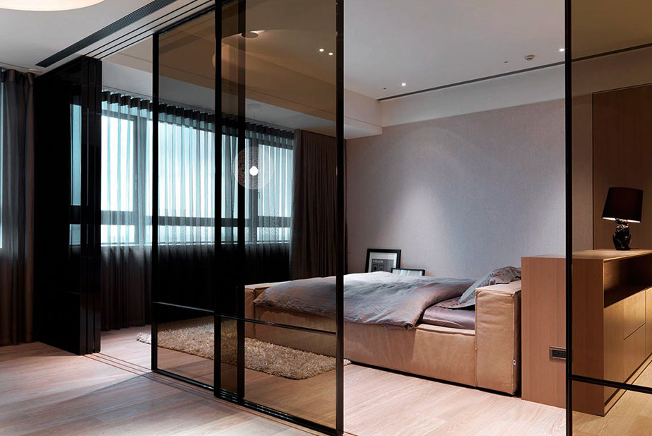 To create a comfortable and private environment in the bedroom, glass doors with frosted glass are installed.