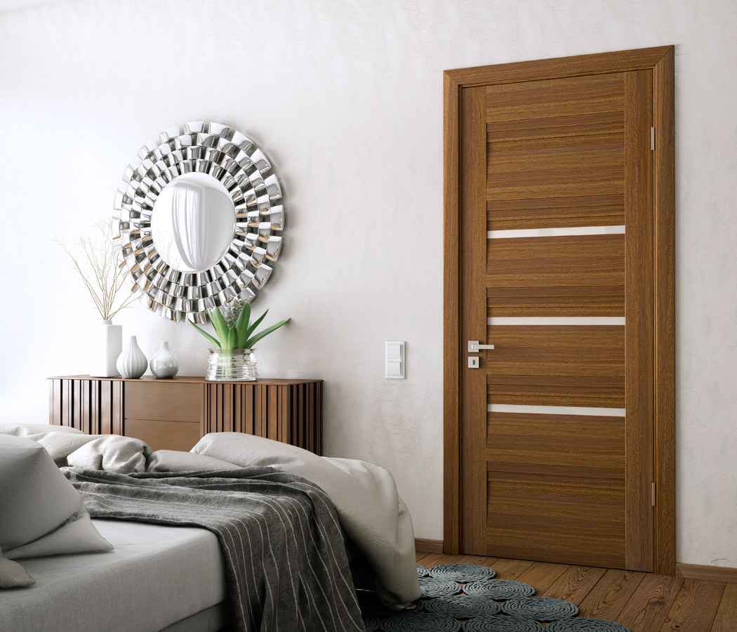 The most suitable material for creating door panels is natural wood, it prevents noise from entering the room, looks beautiful and serves for many years, provided timely and proper care. The bedroom can be fitted with beech, oak, wenge and walnut doors. Thanks to the ability to decorate a wooden canvas with decorative cutting and burning, you can create a decor for any room.