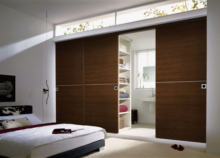 - Sliding. Like a wardrobe, they consist of two doors and move apart in different directions. For a bedroom, this is not the best option, but it allows you to save usable space, especially in a small room. They are installed without platbands (subject to an open wall) or a hidden false wall is specially mounted, in which the structural elements go.