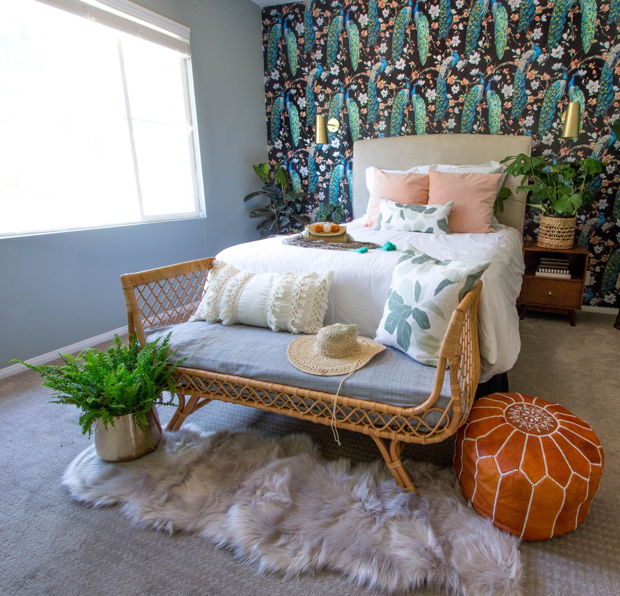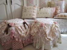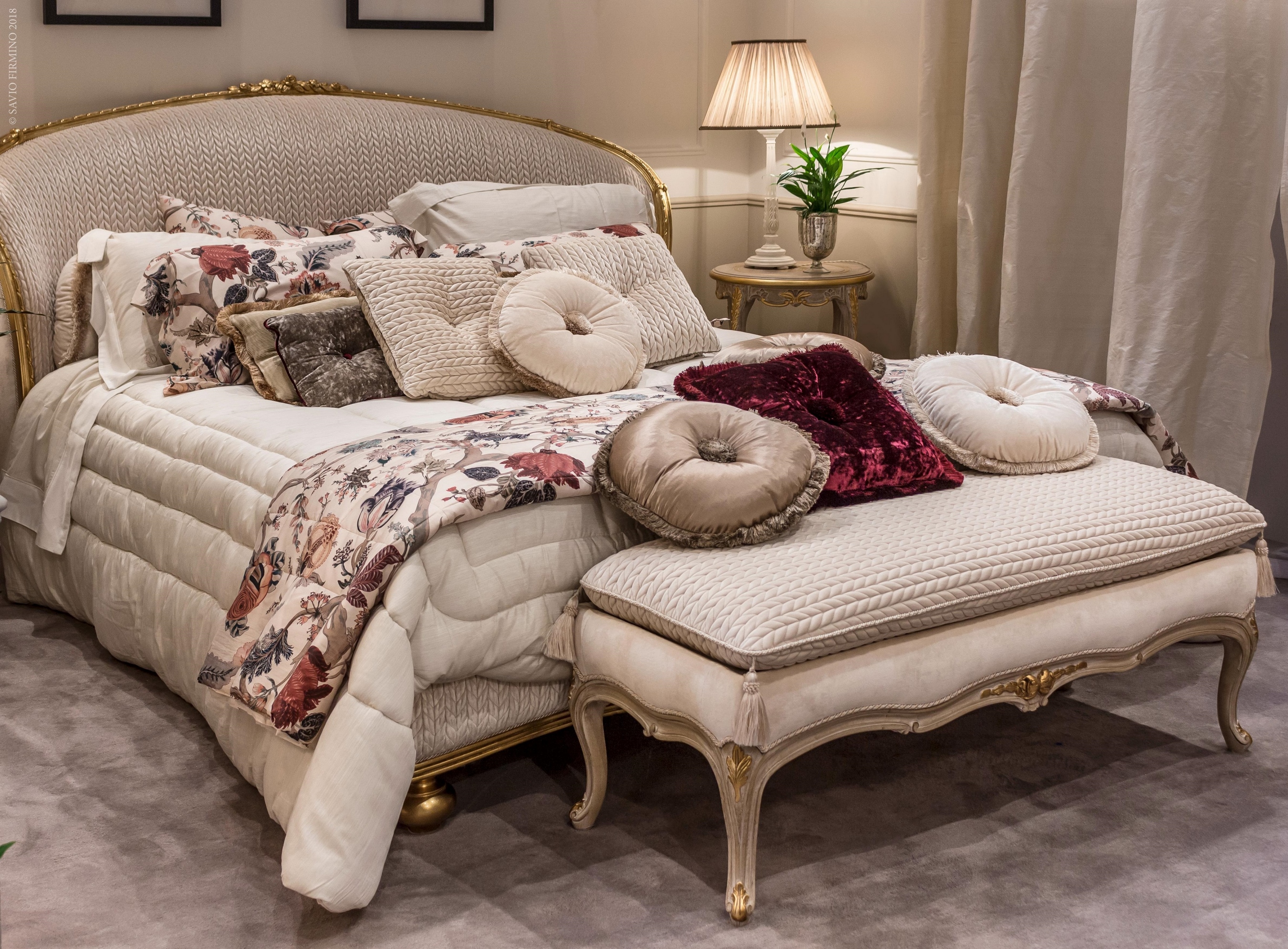 - Bedside beige bench with flirty satin and velvet cushions add a playful boudoir vibe.