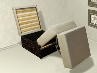 - Transformers are a seat that, with a slight movement of the hand, turns into a small sofa, folding bed or coffee table. There is a pouf cabinet with storage boxes.