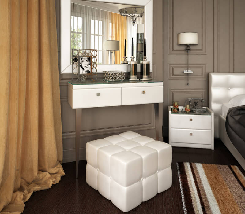 - Ottoman cream moire with chrome legs looks stylish with a dressing table-console.