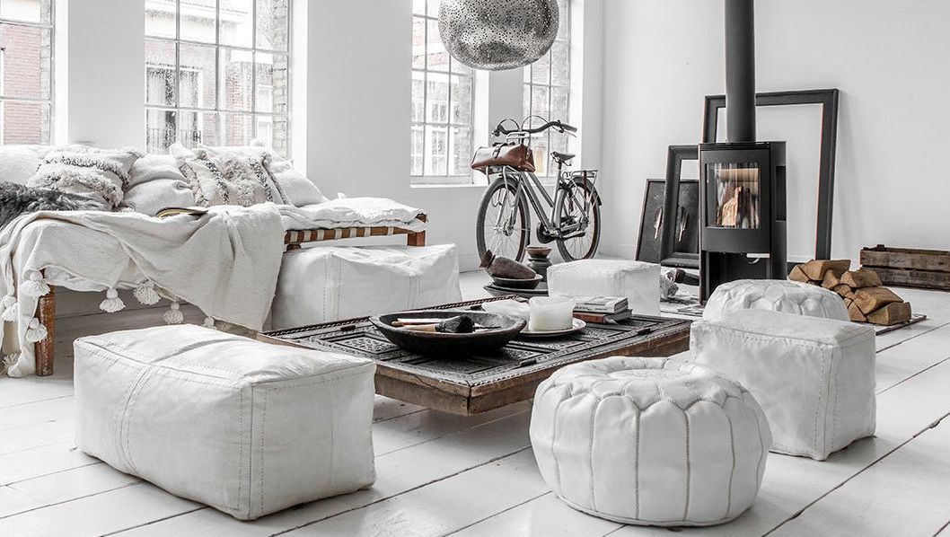 - If space permits, leather accessories will allow you to create an original design. in the loft style. Streamlined shapes and smooth white leather soften the overall composition.