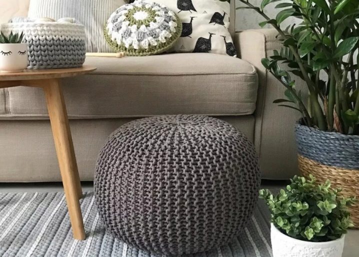- Moroccan pouf in the English style in combination with other knitted decor elements gives a special comfort to the interior.