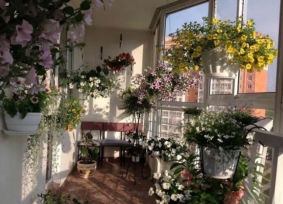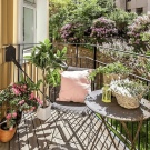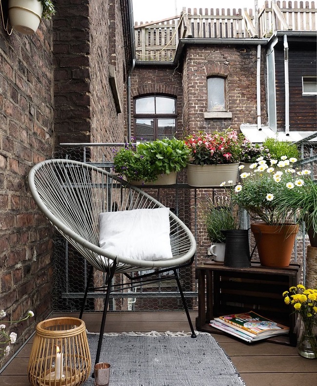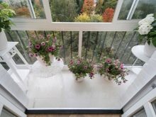 When decorating a balcony from the inside in a private house, near the window, you can install wicker furniture and put a large flowerpot. It is better to cover the chairs with textiles made in a rustic style and decorated with interesting appliqués or braid with your own hands.