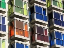 A great idea for decorating a balcony is to use multi-colored glass. Frosted and tinted glass has a high decorative effect, and tinted glass not only decorates the facade, but also avoids intense sunlight. Multicolored stained-glass windows, executed in the form of ornaments and intricate patterns, also look beautiful.