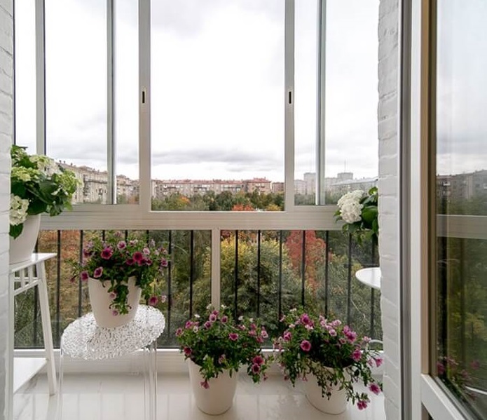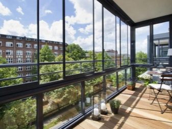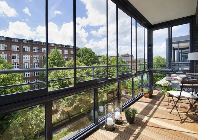 - Panoramic glazing of closed-type French balconies favors good heating of the room on sunny days, which leads to a reduction in heating costs. The area of such balconies can be used as additional living space, all that remains is to insulate the floor and choose a high-quality double-glazed window.
