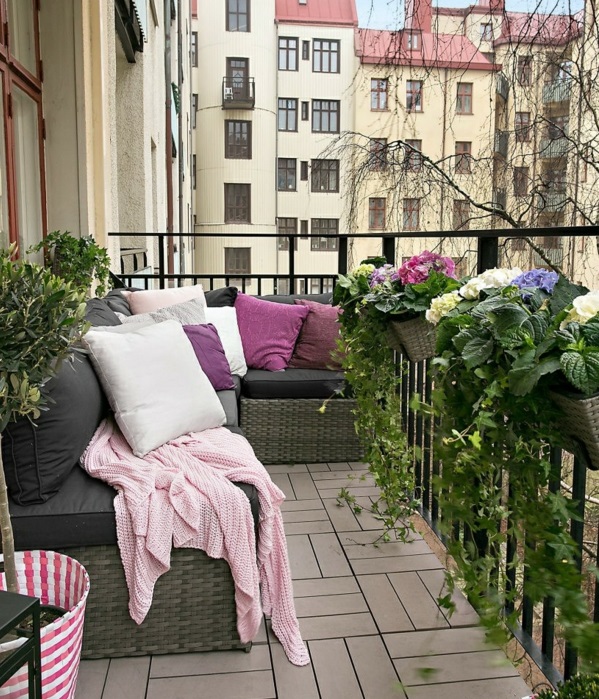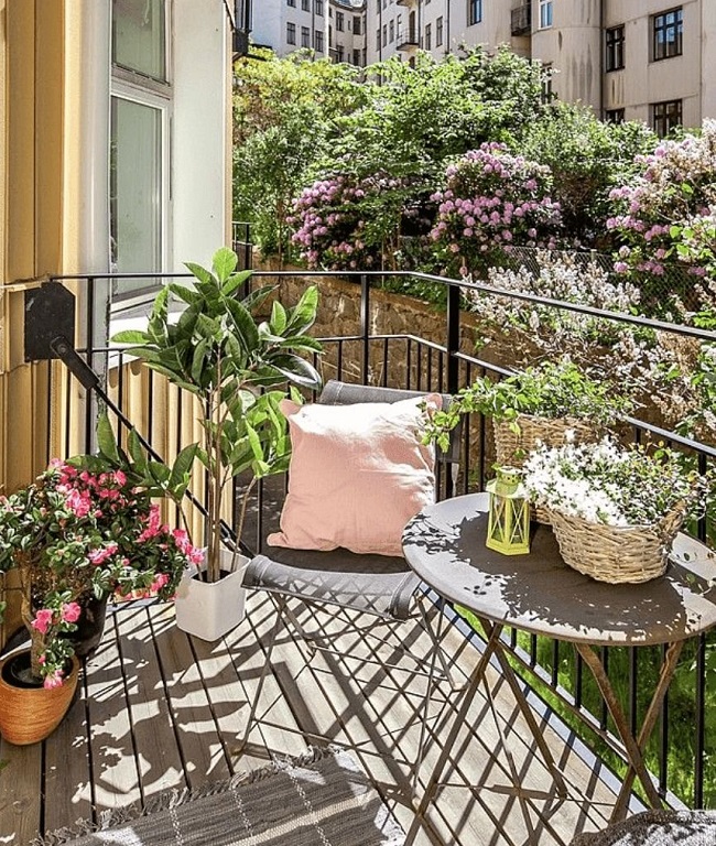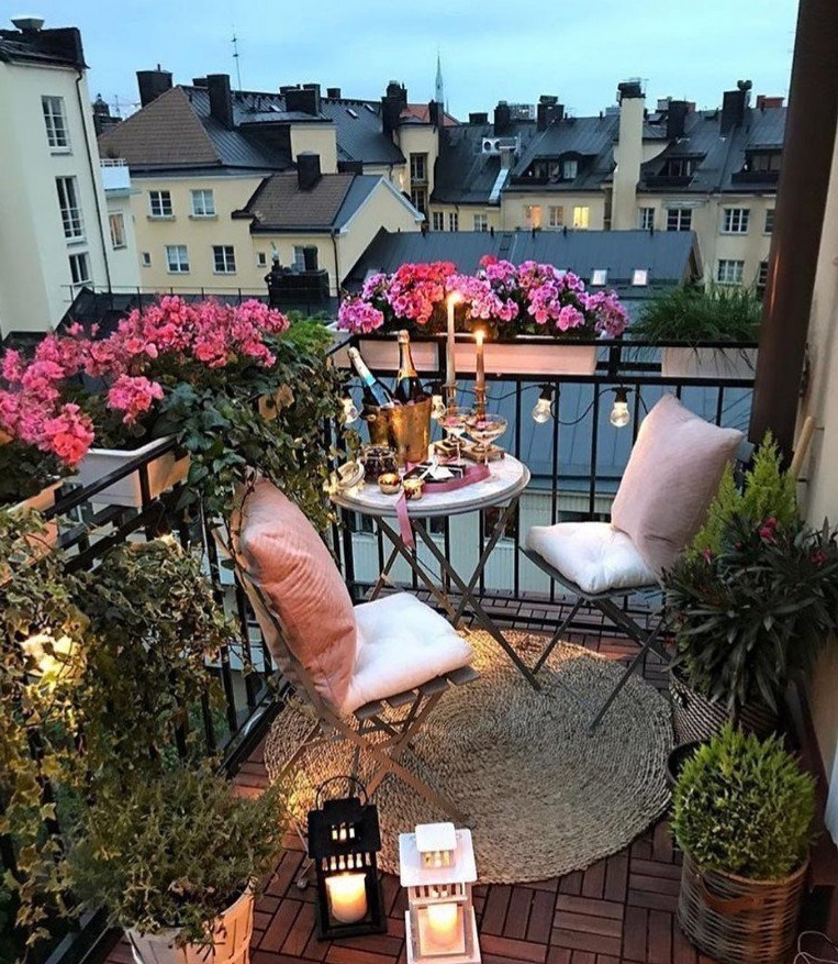 As for the balconies with a large area, you can put a table and a couple of chairs made of natural wood on them and decorate them with a beautiful tablecloth or a bright textile bedspread.