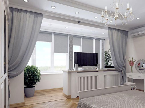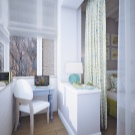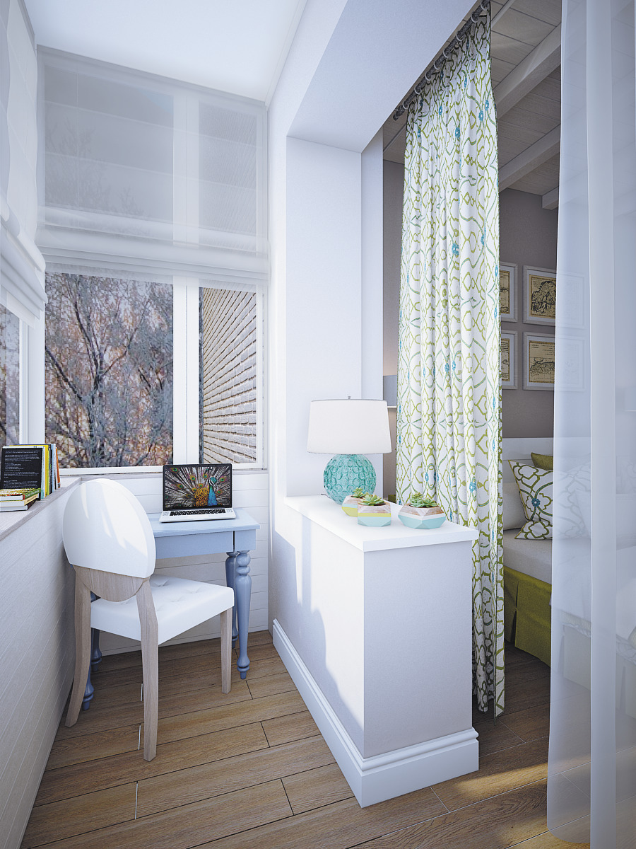 Allocating the room for an office, combined with a room, it can be finished with panels for painting or liquid wallpaper, replace ordinary windows with a door block with French sliding ones, insulate the ceiling with a cork. On the sunny side, even on 6 square meters of area, it is easy to equip a children's or mini-living room.