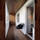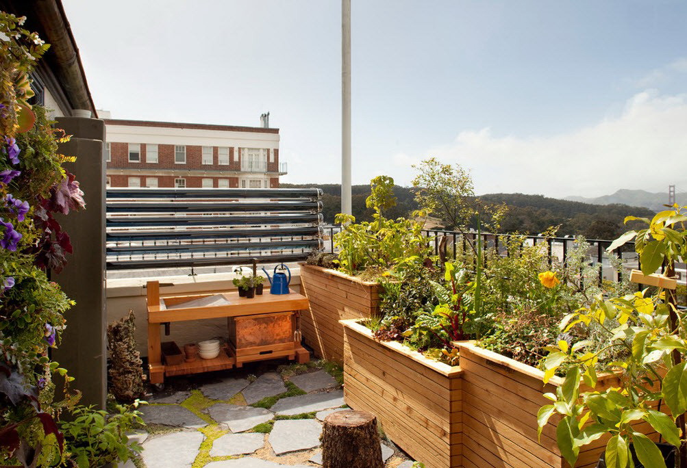 - Open spacious balcony with an unusual natural flagstone floor. The wall and parapet finishes are in harmony with the greenery in large wooden boxes.