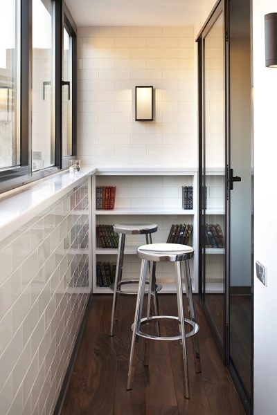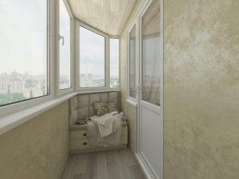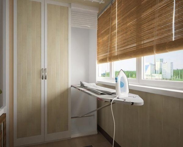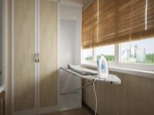 Such a design solution is suitable for a recreation area, organization of a dressing room or an ironing room on a loggia.