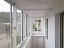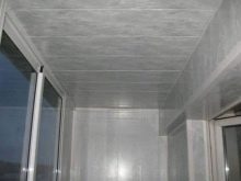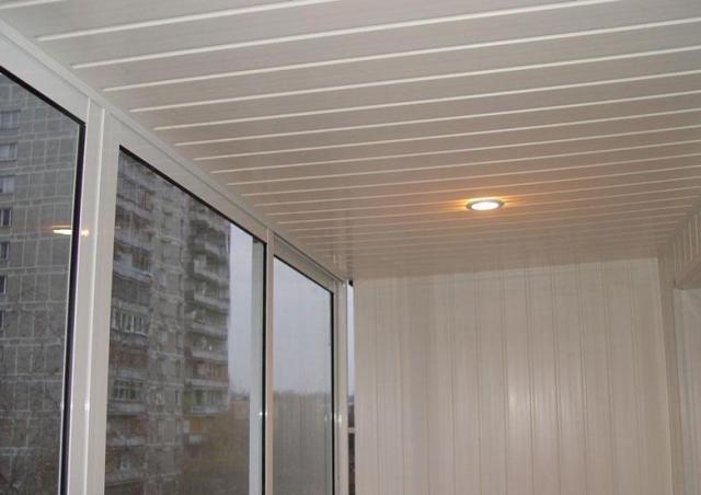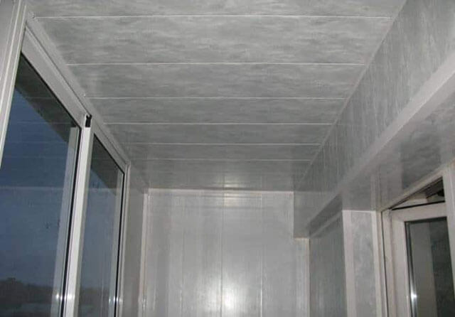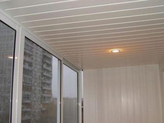 - For the ceiling. Most often, this part of the balcony space is sheathed with light plastic or metal panels, equipped with built-in lighting. In a budget option, you can do with whitewashing or painting the concrete slab with water-based compositions. On high balconies, suspended or stretch ceilings are installed.