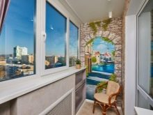 - Luxurious panoramic glazing, large tiles on the floor and artificial stone on the walls. A large balcony with this finish is good to spend evenings in a typical southern city.