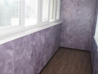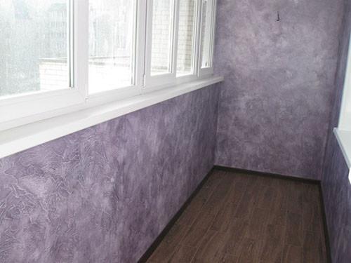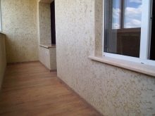- Decorative plaster. The most popular finish is "bark beetle", which looks very attractive. Plastering is suitable for warm and cold balconies, the material is applied to the walls after preliminary leveling, priming. The distribution of the mixture is carried out with a trowel in several layers with intermediate mashing.