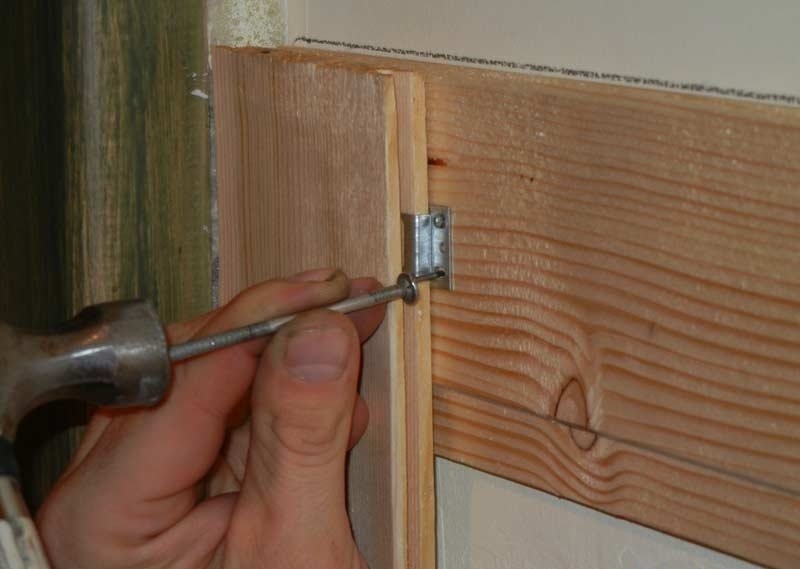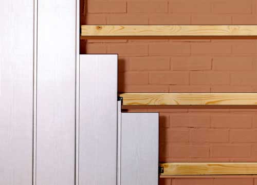 The panels are mounted on a lathing made of a wooden bar with a pitch of 50 cm from the corner, with fixation on clamps. The fittings are closed with special decorative strips.