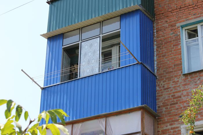 Corrugated sheet material is a good solution for external balcony cladding. The corrugated board provides sufficient rigidity and strength of the fence, retains its properties for 50 years. For finishing balconies and loggias, not ordinary galvanized material is used, but material equipped with a polymer coating. Large sheets are easy to install even at a height, they do not fade in the sun, and are well suited for the subsequent formation of a layer of thermal insulation.