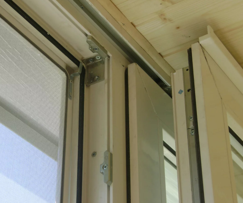 - The doors are inserted into the guides, after which they need to be fixed. For this, special bolts are suitable. It is also necessary to install a kind of "leash" by inserting it into the slot in the end face at the bottom of the door. The "leash" ensures the correct positioning of the structure when opening or closing and does not allow the doors to move.