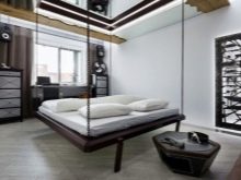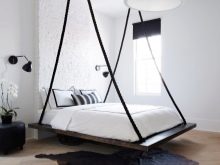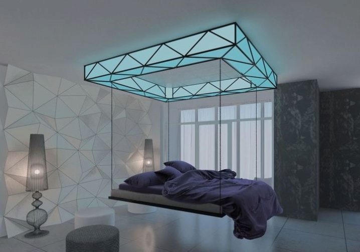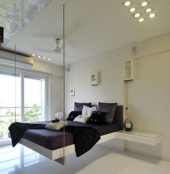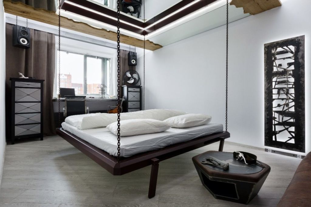 The biggest advantage of a suspended bed is in an unusual and extravagant appearance. The bed becomes the center of the design idea of the room and radically changes it.