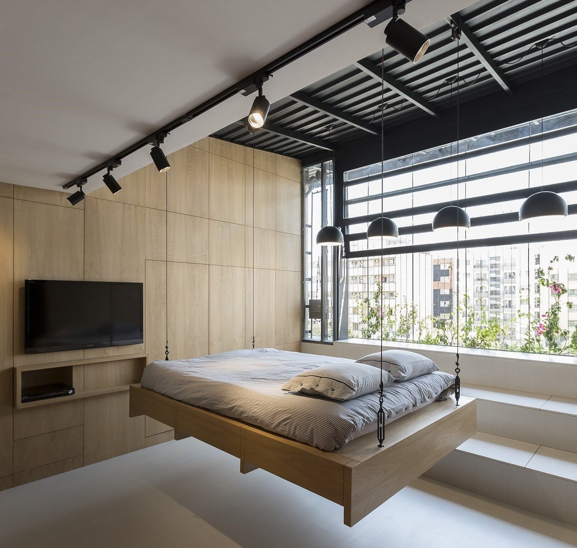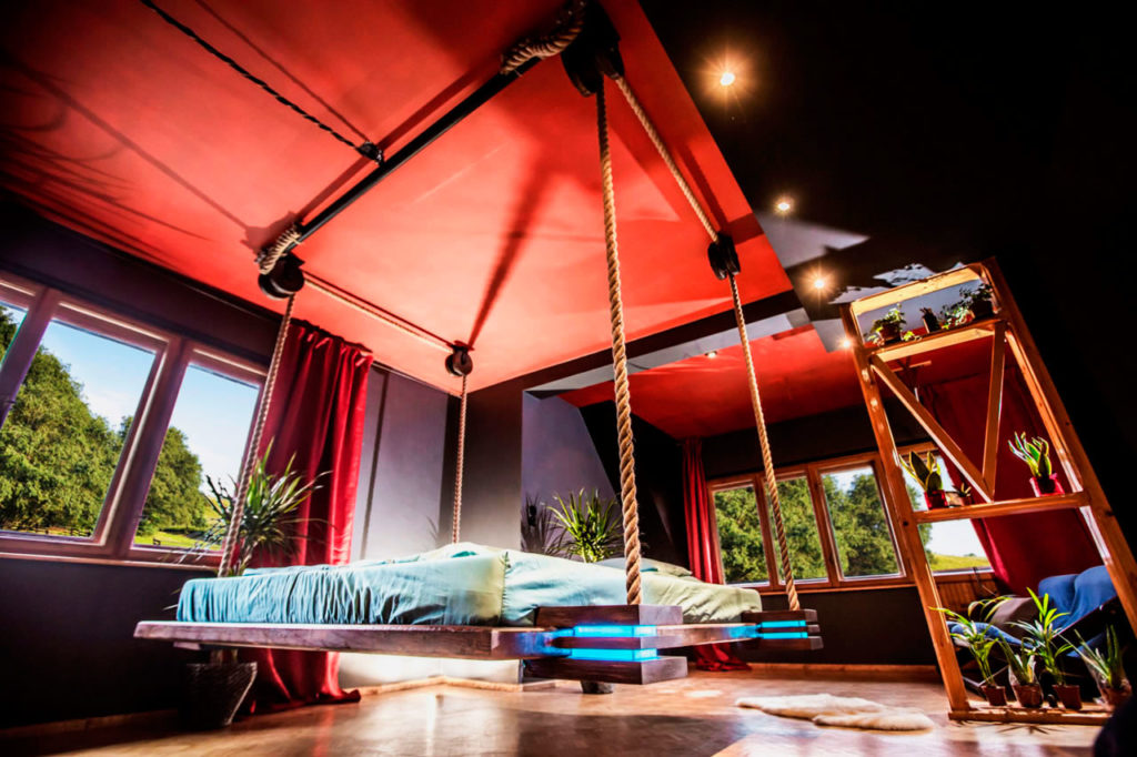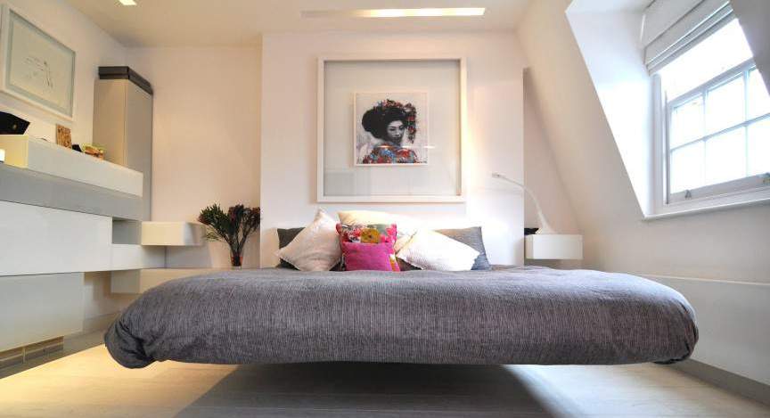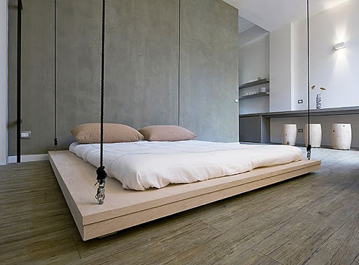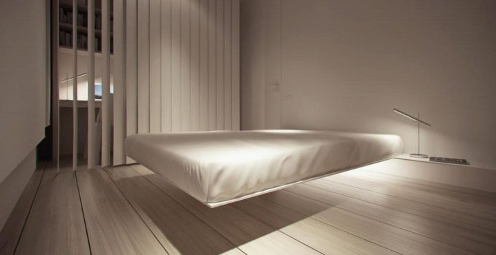 These types of hanging beds are attached with the headboard or sidewall to the wall, thereby losing mobility. The constructions create an amazing floating effect, the illusion of which is enhanced by the lighting under the bed.