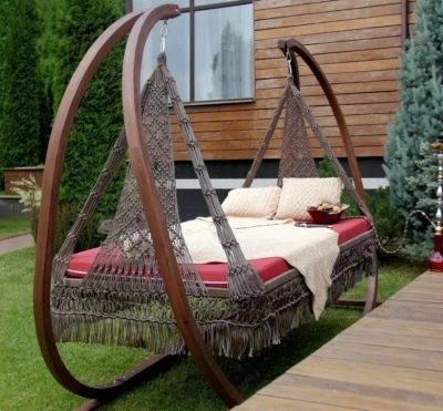 Products are presented much more widely for daytime rest. They are installed in summer cottages, verandas, terraces, on racks in the open air - near pools, in gardens and on playgrounds. The category of day rest includes models of various designs, shapes and materials. We suggest that you familiarize yourself with some of them by examples.
