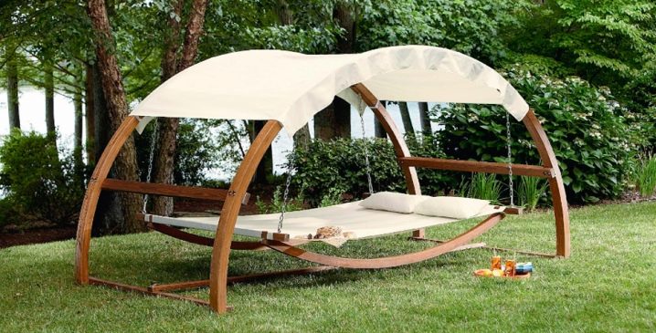 When choosing outdoor beds, you should pay attention to additional amenities in the form of awnings and mosquito nets. The most budgetary options for garden products include a regular hammock.