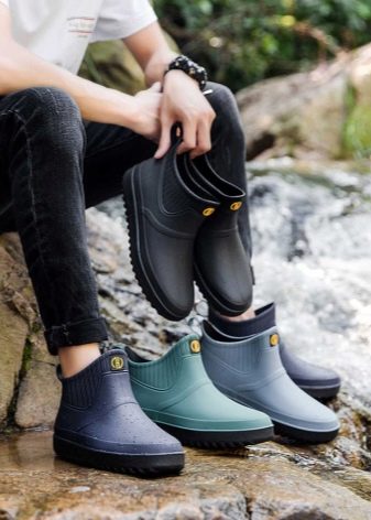 The assortment of men's rubber shoes in modern stores is represented by semi-athletic boots, shoes, as well as boots, ankle boots and galoshes. Depending on the design of the nose, you can purchase models with a wide, tapered, round, semicircular or blunt toe. At the same time, the size of the heel can be small - up to 25 mm, medium - from 25 to 45 mm and without a heel. Models with high heels for men are not produced.