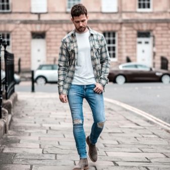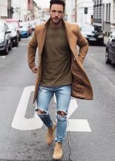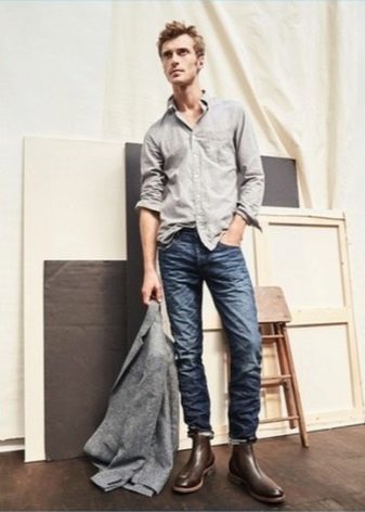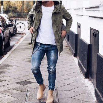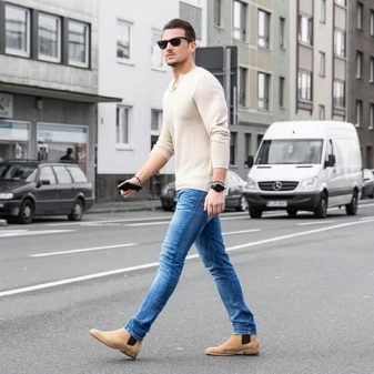 Interesting looks are obtained by combining Chelsea with artificially aged jeans. The main thing is to choose the right matching shades of things. For example, take light blue jeans and sand-colored suede boots.