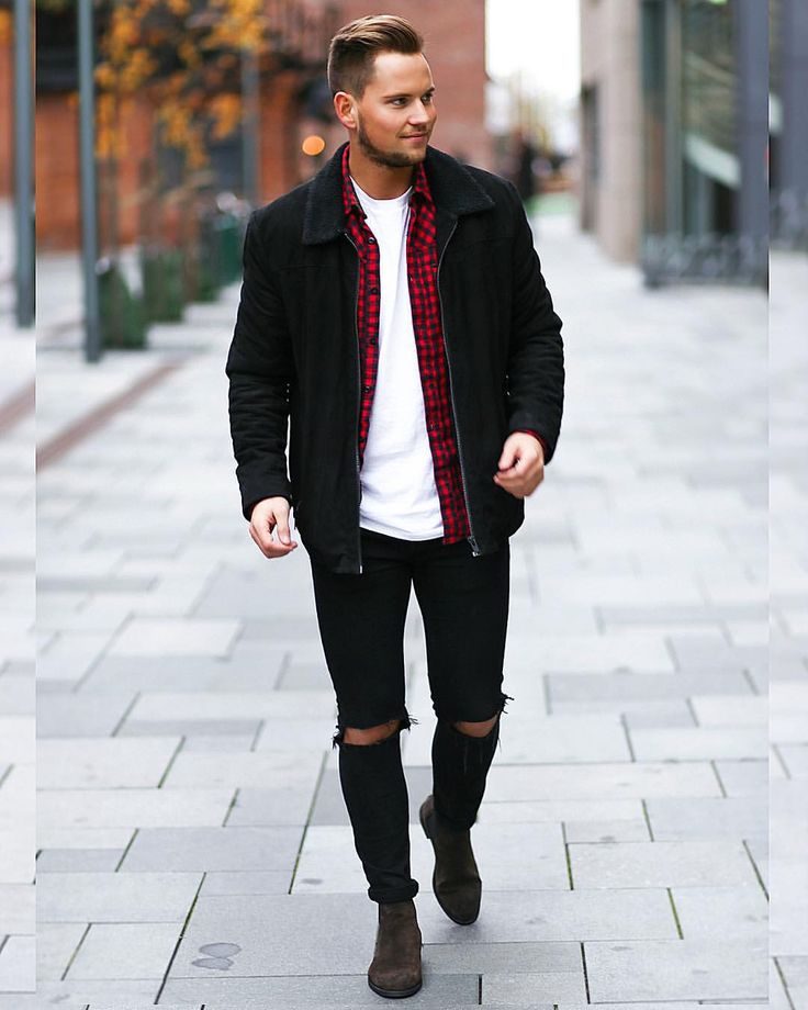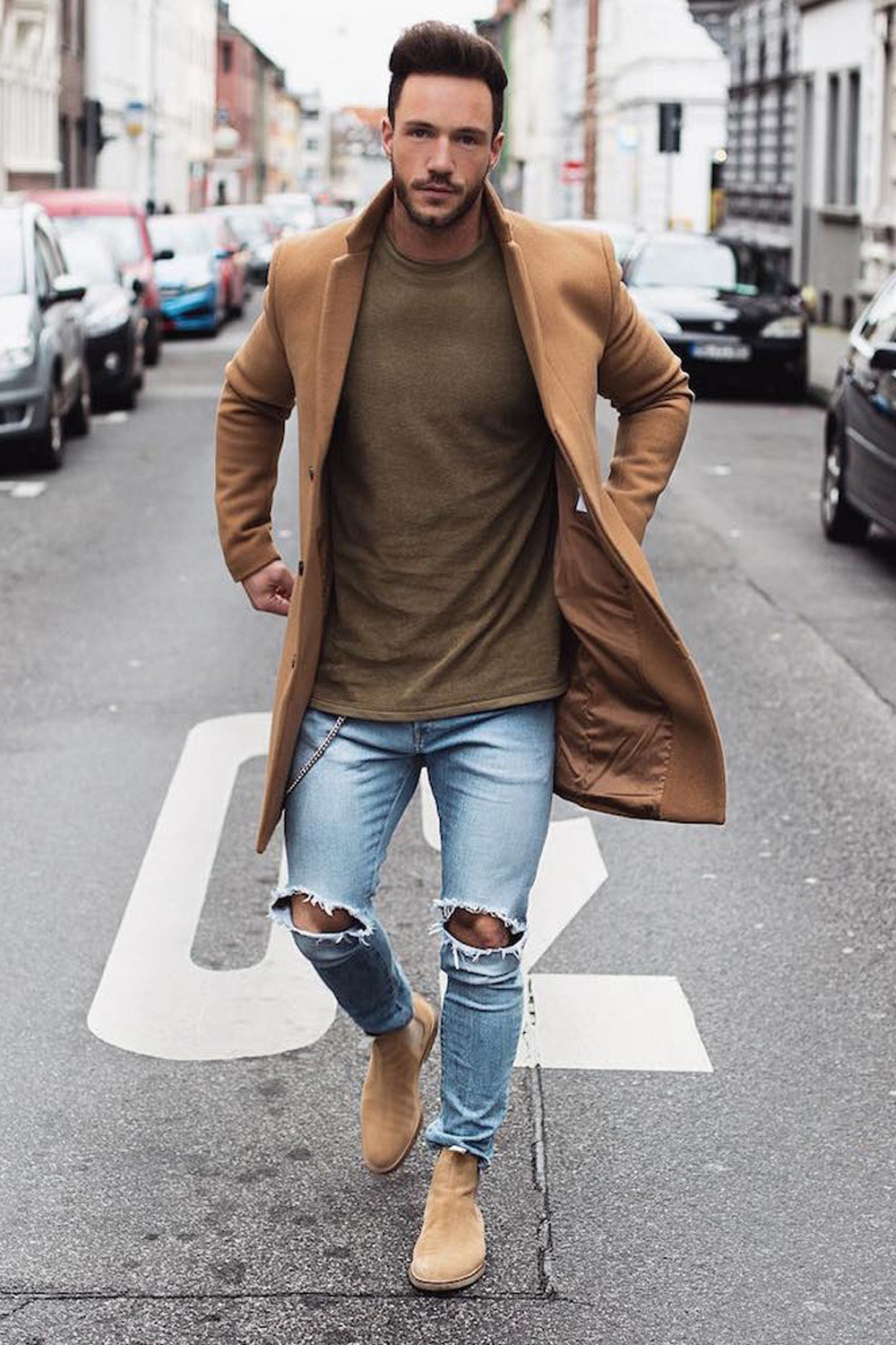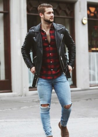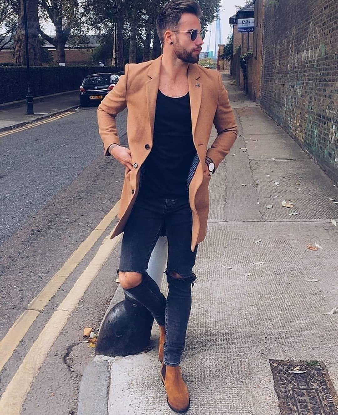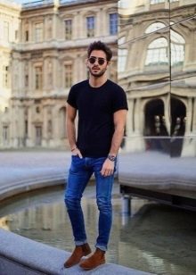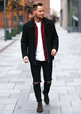 - With men's chelsea, it's easy to create a bold and daring masculine look. To do this, it is enough to choose shoes of a red shade, black skinny and ripped jeans, a black T-shirt with a wide neck. A long coat of the same shade as the shade of shoes will complete such a brutal ensemble. The accessories include a matching wristwatch as well as thin-rimmed black sunglasses.