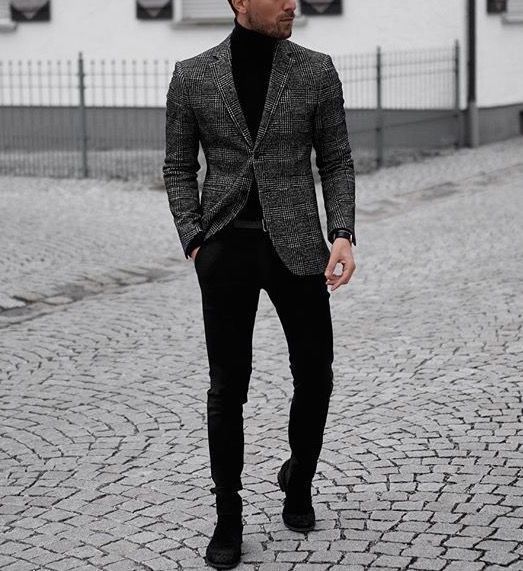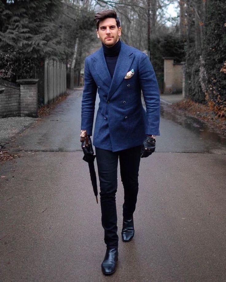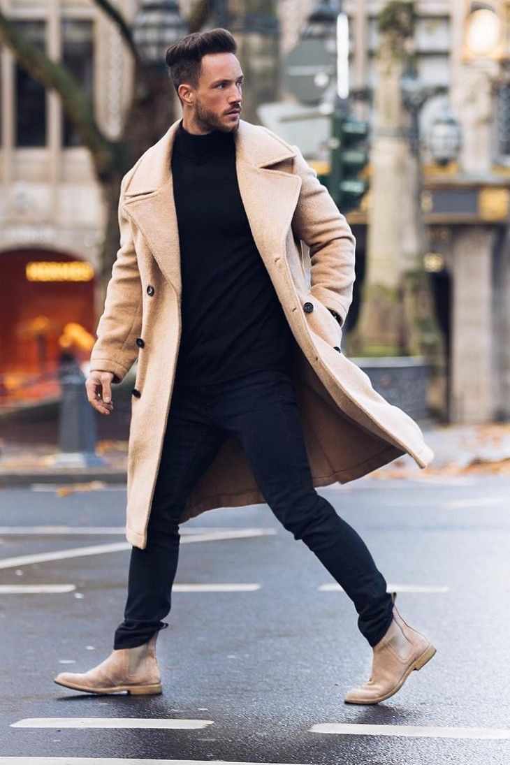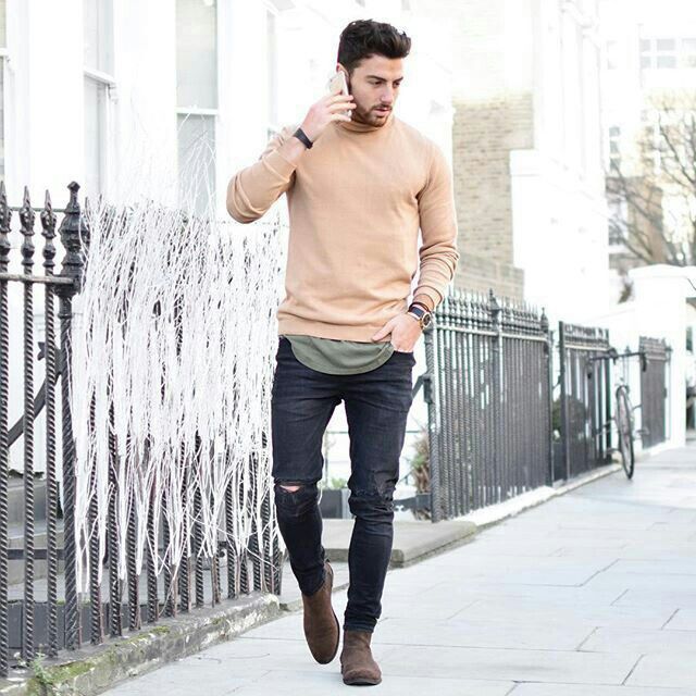 A turtleneck with a high neck looks especially attractive in an image with men's chelsea. An attractive ensemble can also be achieved with a suitable long sleeve.