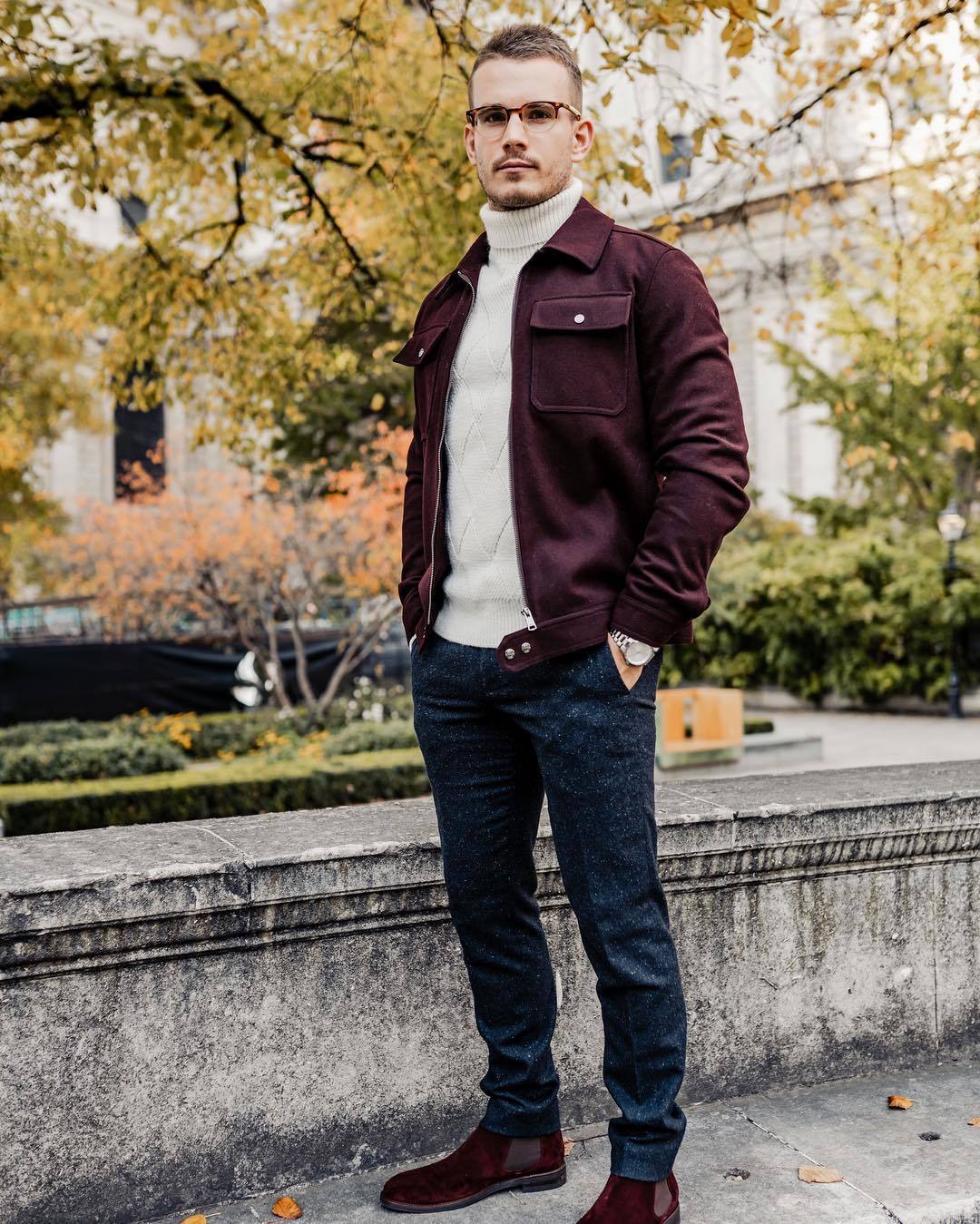 - Elegant burgundy suede chelsea can be combined with skinny black or blue and black jeans, a white turtleneck sweater, and a jacket in a color that is a couple of tones different from the shoes. Of the accessories, there will be enough attractive wristwatches.