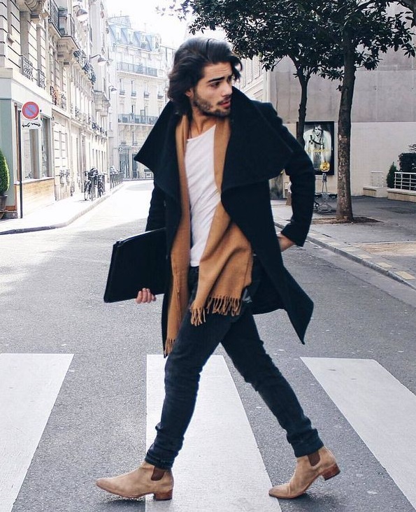 - Suede boots with a velvety surface of a pale sand shade will chicly complement skinny black or dark graphite jeans, a white T-shirt, as well as a black coat with a length above the knee and a large collar. You can complete such a simple but very attractive ensemble with a large and long scarf in a pale brown or ginger shade.