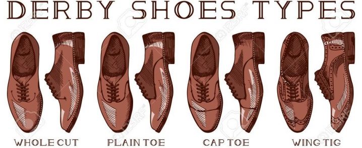 Derbies are divided into several groups. On sale there are models plain toe, cap toe, stitch cap, moc toe, split toe, Norwegian toe, Algonquin.