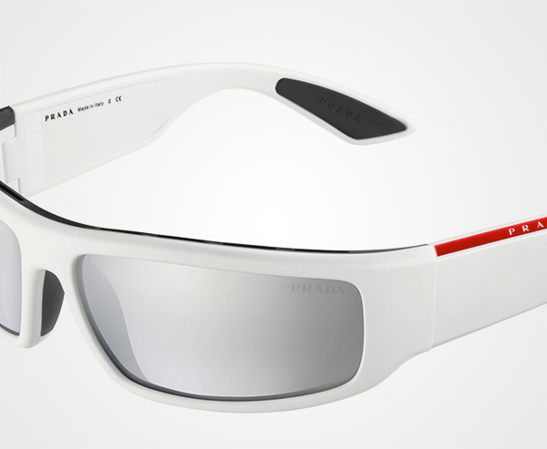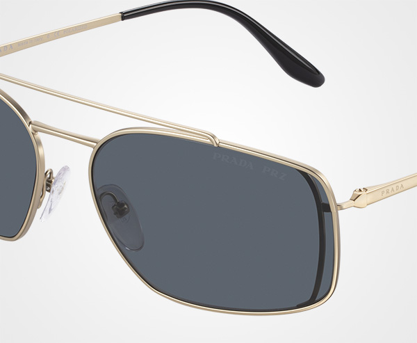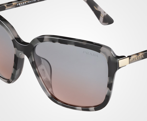 - If you look at the upper outer corner of the left lens of your glasses, you can see the transparent brand logo. It is not only noticeable, but also tangible. Swipe your finger gently and you'll see that the word Prada is etched into the lens, not just printed.