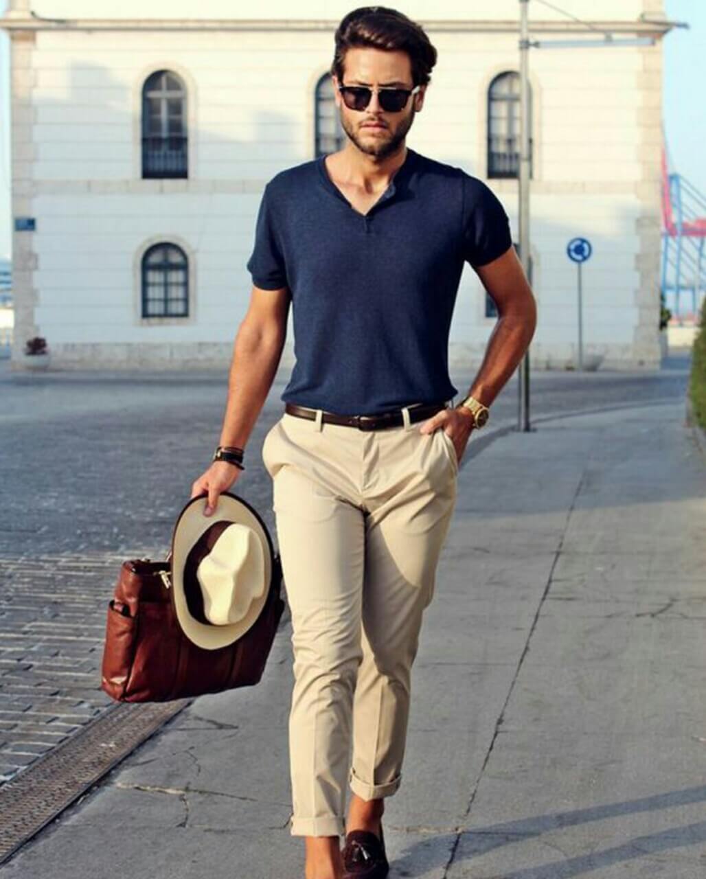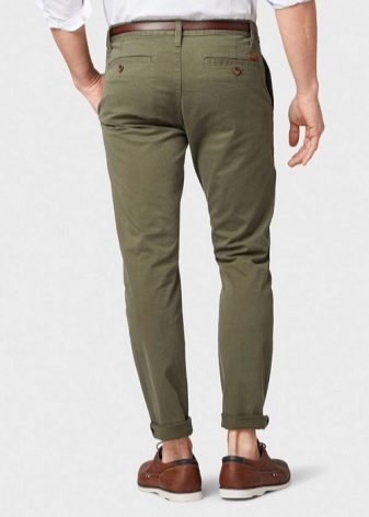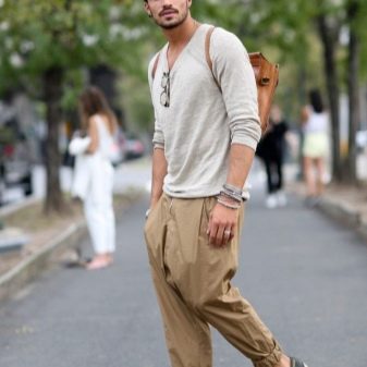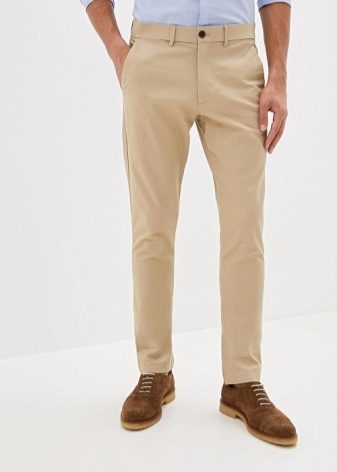 - Chinos. This is the name of the summer models of trousers, which have a spacious, but slightly tapered silhouette. In most cases, chinos are made in light colors such as sand.