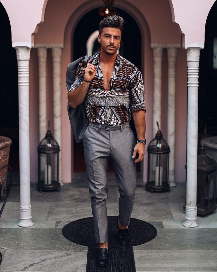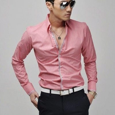 - A silk pale pink shirt with white lines along the buttons will harmonize very well in a composition with dark gray or black straight trousers, complemented by a white leather strap. Sunglasses-aviators and a dark pendant on a chain will be useful accessories.