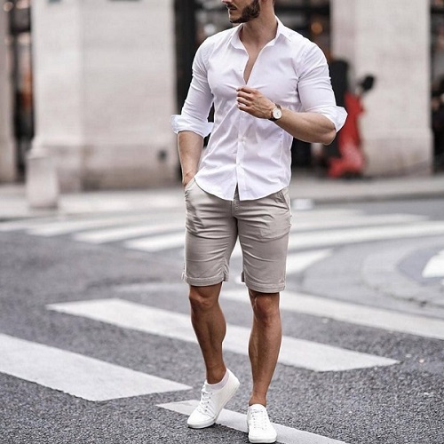 - A white shirt with sleeves ¾ looks amazing in combination with cream or pale gray breeches / cropped trousers and snow-white sports shoes. A beautiful look can be complemented by a watch with a brown leather strap and sunglasses.