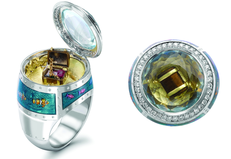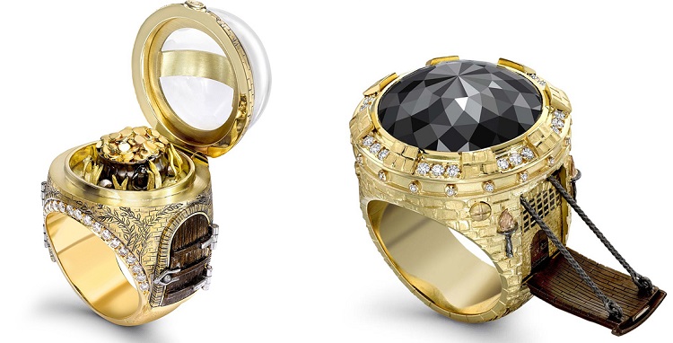 Ring Castle made in the form of an ancient castle, the surface of which is covered with a black diamond. The secret of such a ring lies in the sliding bridges on the sides. Damiani Jewelry House makes unique rings endowed with charm and sophistication. A distinctive feature of the rings of the presented brand is the engraved letter D, filled with white gold and diamonds.