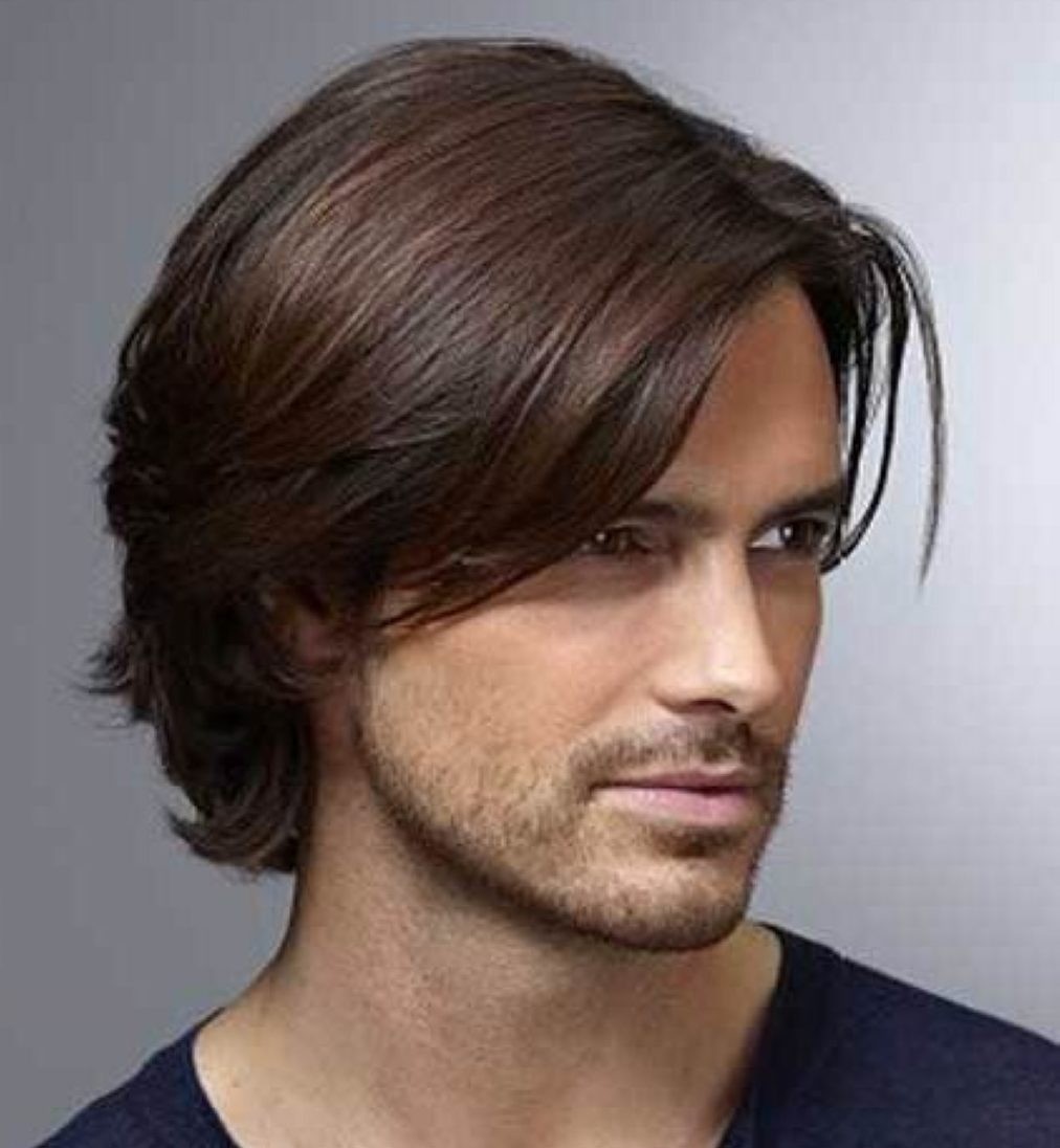 Long bangs, laid on one side, can create an optical miracle. This option will perfectly fit even in a prim business outfit, but in general it is a versatile haircut. If style permits, voluminous hairstyles combined with a beard and mustache will perfectly narrow the face. This option can be laid down more strictly.