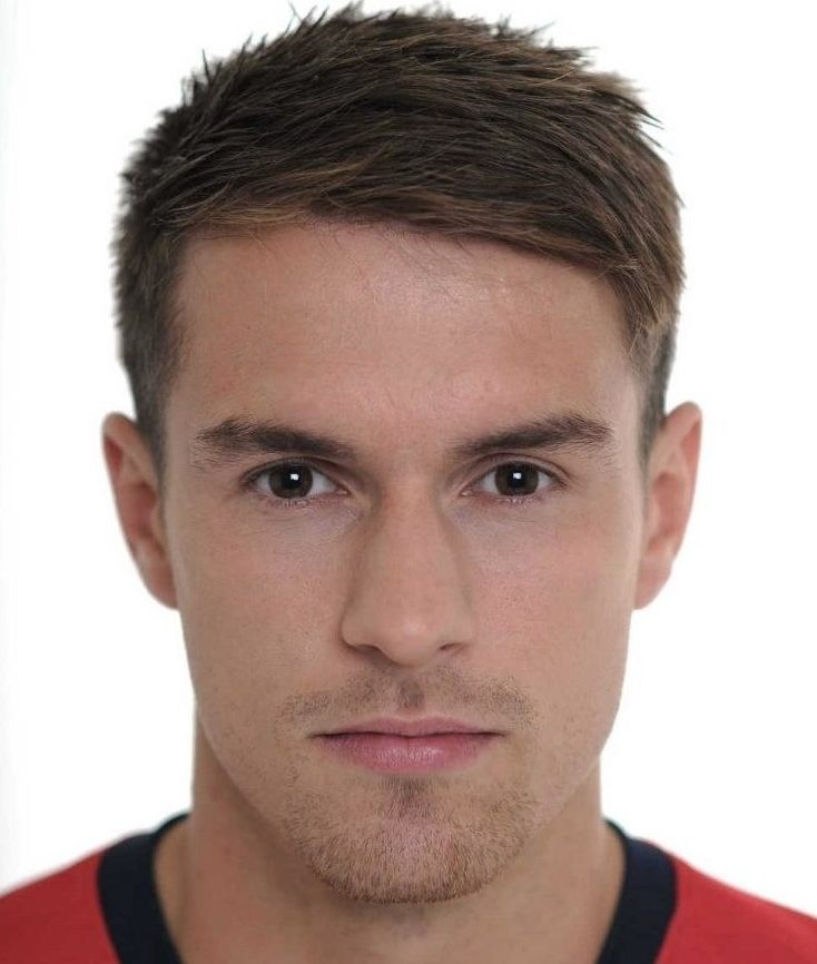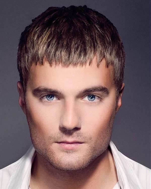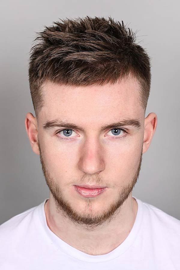 - The main problem of men with a triangular and diamond-shaped face - Pointed chin and wide forehead. In this case, the best solution would be sports haircuts with minimally raised hair at the crown and raised bangs. Avoid voluminous hairstyles with straight cut bangs - this will further stretch the face and enlarge the forehead. Close attention should also be paid here to a sharp chin, which can be visually smoothed out with smooth oblique lines of curls at the crown. But options like a hedgehog are contraindicated here.