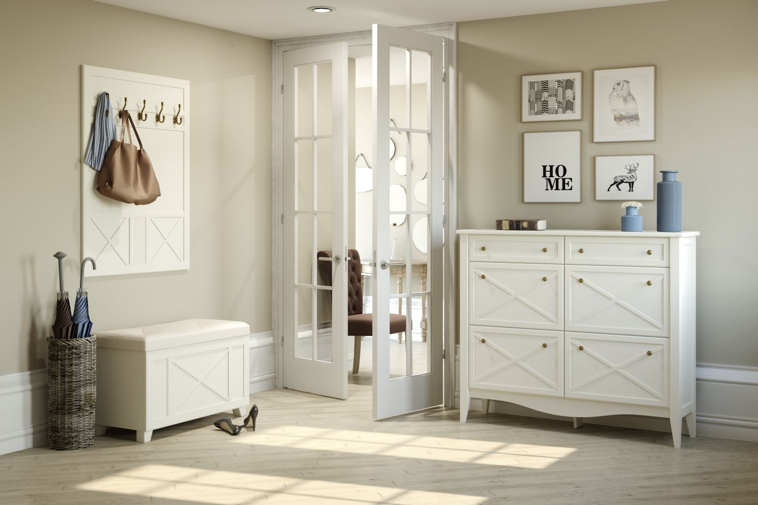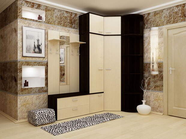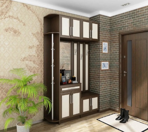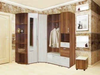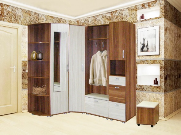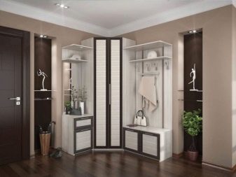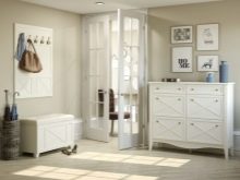 The basic set includes a wardrobe or a rack with closed shelves and drawers, a bench, a hanger, shelves, a cabinet. Sometimes only the so-called hallways are bought. In other cases, everything you need is located in built-in wardrobes, leaving the rest of the space free.