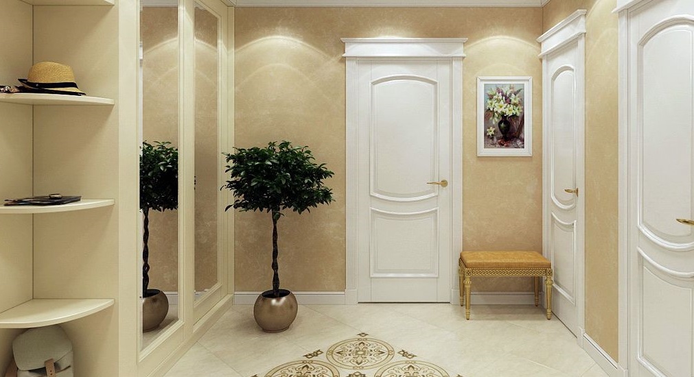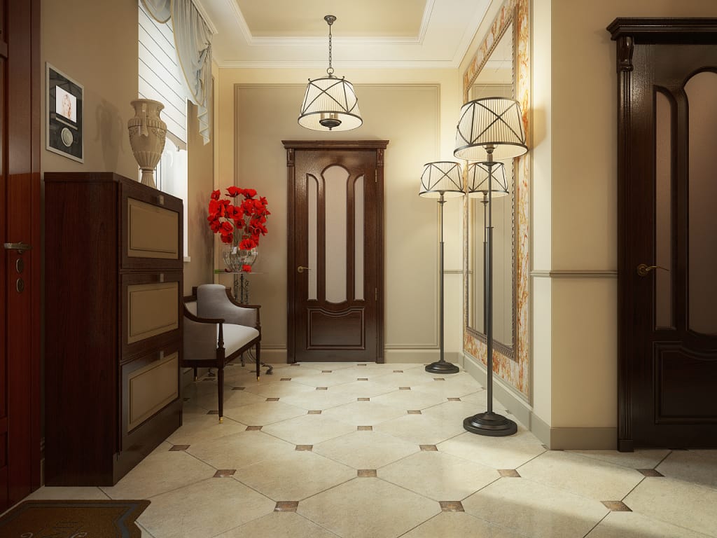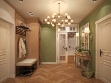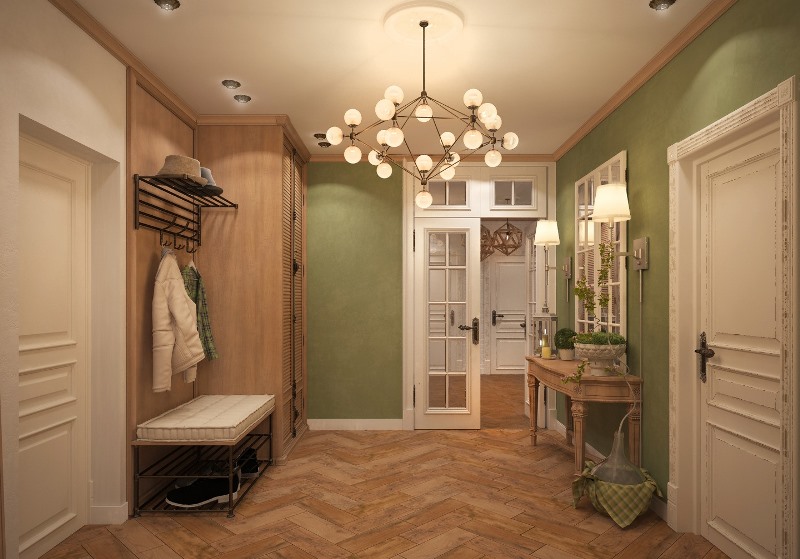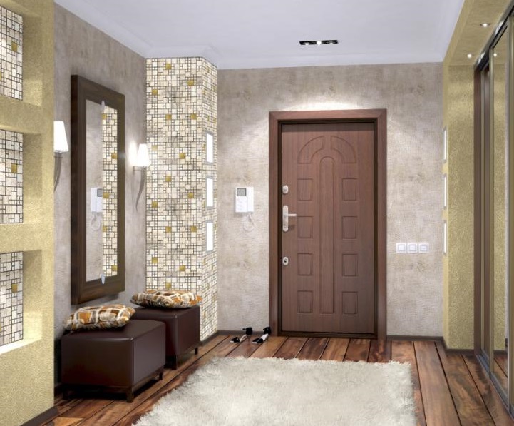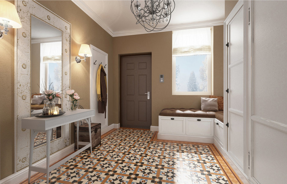 Finishing materials for a square hallway are selected taking into account the chosen style.