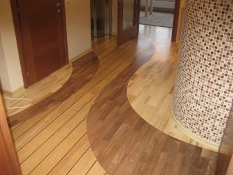 The combination of parquet and linoleum looks good in design. With the right choice of color and texture, the materials look like a single floor canvas. The connecting elements of the two finishes can be sills or small mosaics.