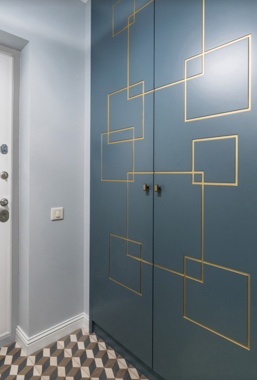 - An example of embedding furniture on both sides of the front door, functional filling of space with storage systems.