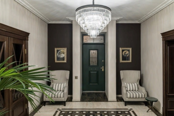 - Entrance hall of a private house with a symmetrical arrangement of furniture.