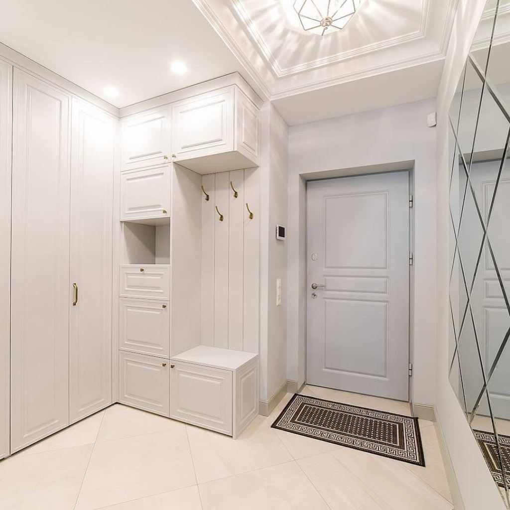 The design possibilities of a square hallway are varied. However, if the room is small, difficulties may arise. The specifics of the layout may be the determining factors. You will have to take into account the location of ledges, niches, windows, doors, the level of natural light.