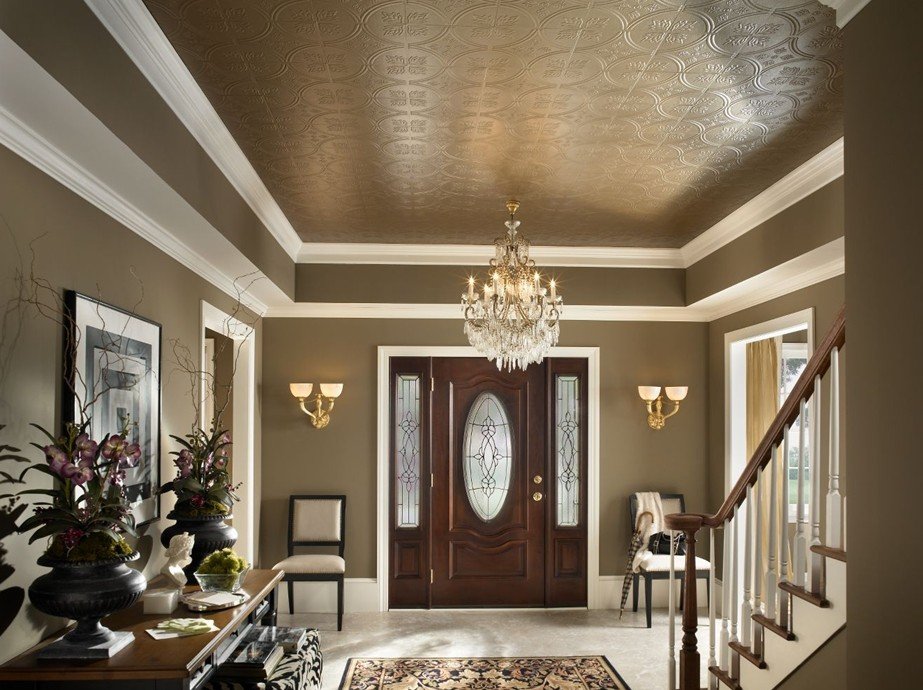 The configuration of plasterboard ceilings varies. The larger the hallway area, the more difficult it can be. With drywall, you can hide the difference in wall heights. It does not need priming and leveling of the base.