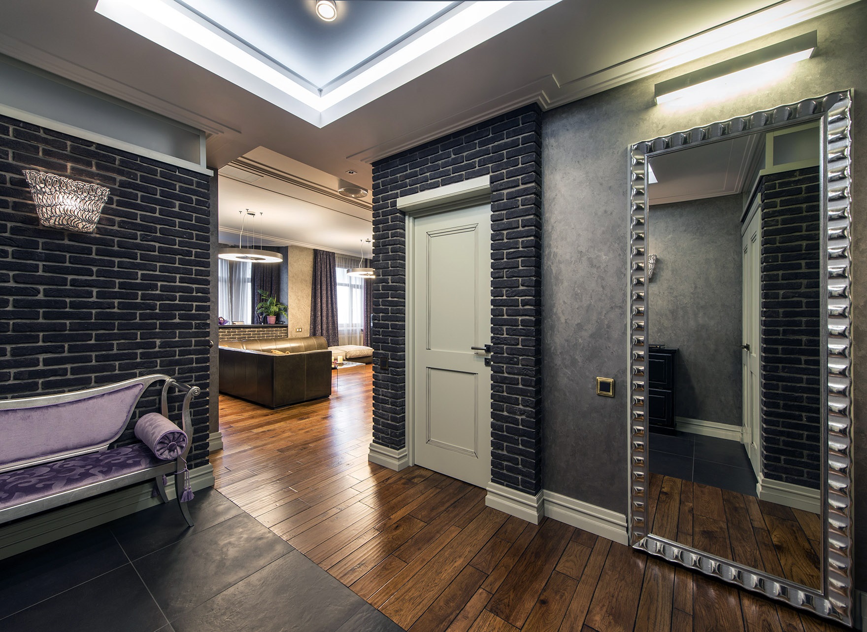 The correct choice of wall cladding will simplify the renovation of the room and set the right mood. You can decorate the walls of the hallway with plain or liquid wallpaper, plaster, decorative stone, tiles and paint.