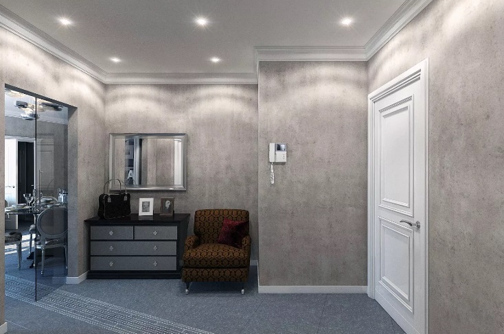 The use of combined lighting is in trend. It consists of a central (ceiling) lamp and additional wall lighting. The main light source in the hallway is a chandelier or tape (spot) lighting around the perimeter of the ceiling.